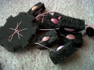 After many trials and errors, I have perfected this Kumihimo braiding tool. Cardboard was too squeaky, or too flimsy. Paper was weak. The best cheap free way is leftover packing foam. LOL.